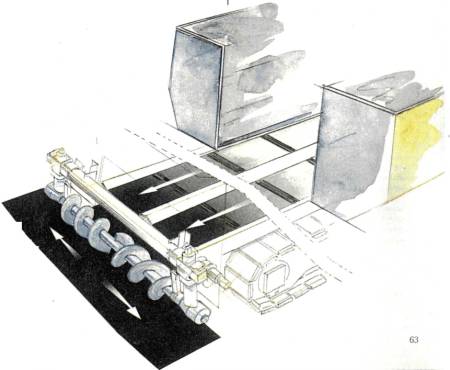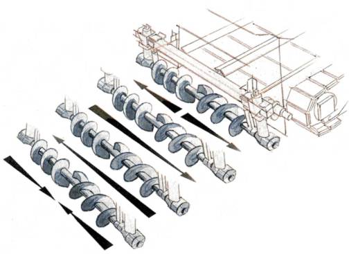 ПЕРЕМЕЩЕНИЕ СМЕСИ В УКЛАДЧИКЕ Асфальтобетонная смесь загружается в приемный бункер укладчика при соприкосновении с задней частью шин грузовика. Смесь подается из бункера в заднюю часть машины двойным или одиночным пластинчатым конвейером, а затем на шнековый конвейер (шнек), который распределяет смесь в поперечном направлении на всю рабочую ширину плиты. Высотное положение шнека регулируется для получения слоя различной толщины. Поток материала регулируется скоростью пластинчатого конвейера. На современных укладчиках скорость конвейера автоматически корректируется скоростью движения укладчика вперед и толщиной материала, который распределяется перед плитой. Эта толщина должна оставаться по возможности постоянной.