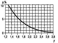 Рисунок 1 - Процентили р максимальных уровней звукового давления единичных звуковых событий, превышающих на y стандартных отклонений среднеарифметическое значение при нормальном распределении максимальных уровней звукового давления Пример - Если пять из прошедших 500 автомобилей имеют наивысший уровень шума, то процентиль равен (5/500)·100 = 1 %. По рисунку 1 находят значение у = 2,33 @ 2,3 и подставляют в формулу (3).