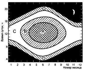 Рисунок А.4 - Временные интервалы, когда высота солнца и, следовательно, температурный градиент находятся в известных пределах в зависимости от широты
