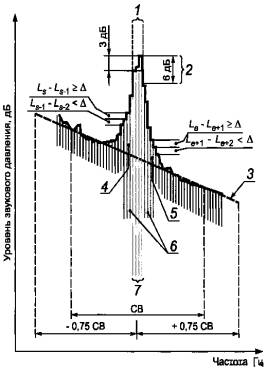 Признаки тонов указаны в С.2.3.1. Это определение относится как к тонам, так и к узкополосному шуму. Ширина полосы пика определяется границами, в которых уровень звукового давления на 3 дБ ниже максимального уровня звукового давления в шумовом интервале (правило 3 дБ).