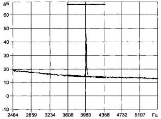 Пример 1 Критическая полоса (показана в верхней части рисунка): 3,6 - 4,4 кГц Тон: 4 кГц Уровень тона Lpt; 46,7 дБ Ширина полосы тона по правилу 3 дБ: 0,5% критической полосы 800 Гц Lpn в критической полосе: 37,3 дБ Слышимость тона ∆Lta:13,7 дБ относительно маскирующего порога (далее -МТ) Коррекция КT: 6 дБ. |