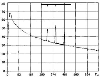 Пример 2 Критическая полоса: 380 - 480 Гц Тоны: 395 Гц, 53,1 дБ; 468 Гц, 47,0 дБ Уровень тона Lpt: 54,1 дБ Ширина полосы тона по правилу 3 дБ: 3,1 % критической полосы 100 Гц Lpn в критической полосе: 45,2 дБ Слышимость тона ∆Lta; 11,1 дБ относительно МТ Коррекция КТ: 6 дБ. |