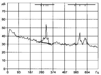 Пример 3 Критическая полоса: 258 - 358 Гц Тоны: 278 Гц, 33,3 дБ; 299 Гц, 38,4 дБ; 319 Гц, 54,3 дБ; 334 Гц, 37,1 дБ Уровень тона Lpt: 54,6 дБ Ширина полосы тона по правилу 3 дБ: 3,4 % критической полосы 100 Гц Lpn в критической полосе: 45, 5 дБ Слышимость тона ∆Lta:10,6 дБ относительно МТ Коррекция КT: 6 дБ. |