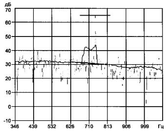Пример 4 Критическая полоса: 680 - 830 Гц Тоны изменяются от 680 до 830 Гц Уровень тона Lpt: 53,6 дБ Lpn в критической полосе: 45, 5 дБ Слышимость тона ∆Lta: 10,7 дБ относительно МТ Коррекция КТ: 6 дБ. |
