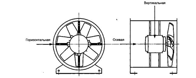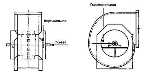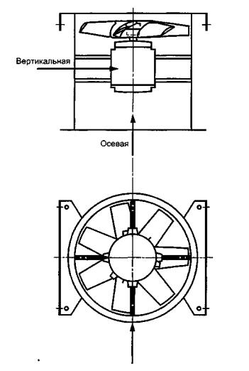 Рисунок 3 -Расположение трехкоординатного датчика для радиального вентилятора двустороннего всасывания Рисунок 4 -Расположение трехкоординатного датчика для вертикально установленного осевого вентилятора Измерения в горизонтальном направлении следует проводить под прямым углом к оси вала. Измерения в вертикальном направлении должны быть проведены под прямым углом к горизонтальному направлению измерений и под прямым углом к валу вентилятора. Измерения в продольном направлении следует проводить в направлении, параллельном оси вала. 8.1.2 Измерения с использованием датчиков инерционного типа Все значения вибрации, указанные в настоящем стандарте, относятся к измерениям, выполненным с помощью датчиков инерционного типа, сигнал которых воспроизводит движение корпуса подшипника. Применяемые датчики могут быть либо акселерометрами, либо датчиками скорости. Особое внимание следует уделить правильному креплению датчиков: без зазоров по опорной площадке, качаний и резонансов. Размер и масса датчиков и системы крепления не должны быть чрезмерно большими, чтобы не вносить существенных изменений в измеренную вибрацию. Суммарная погрешность, обусловленная способом крепления датчика вибрации и калибровкой измерительного тракта, не должна превышать ± 10 % значения измеряемой величины. 8.1.3 Измерения с использованием датчиков бесконтактного типа По соглашению между пользователем и изготовителем могут быть установлены требования к предельным значениям перемещения вала (см. ГОСТ ИСО 7919-1) внутри подшипников скольжения. Соответствующие измерения могут быть проведены с помощью датчиков бесконтактного типа. В этом случае измерительная система определяет перемещение поверхности вала относительно корпуса подшипника. Очевидно, что допустимая амплитуда перемещений не должна превышать значения зазора в подшипнике. Значение внутреннего зазора зависит от размера и типа подшипника, нагрузки (радиальной или осевой), направления измерений (отдельные конструкции подшипников имеют отверстие эллиптического типа, для которого зазор в горизонтальном направлении больше, чем в вертикальном). Многообразие факторов, которые следует принимать во внимание, не позволяет установить единые предельные значения перемещения вала, однако некоторые рекомендации представлены в виде таблицы 3. Значения, приведенные в этой таблице, представляют собой процентное отношение к общему значению радиального зазора в подшипнике в каждом направлении. Таблица 3 -Предельное относительное перемещение вала внутри подшипника