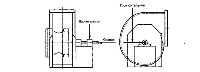 Uper = m eрег - допустимый остаточный дисбаланс (момент), г·мм; ω = 2πN/60, рад/с. В большинстве случаев допустимый остаточный дисбаланс в каждой из двух плоскостей коррекции можно рассматривать равным Uper/2 (см. приложение Е). По возможности колесо вентилятора следует уравновешивать вместе с валом, который будет использован при сборке вентилятора. При использовании оправки плотность посадки колеса на оправку должна быть достаточной, чтобы избежать появления дополнительного эксцентриситета (см. приложение В). Измерения и расчет остаточного дисбаланса проводят по ГОСТ ИСО 1940-1. 8 Вибрация вентиляторов8.1 Требования к проведению измерений 8.1.1 Общие положения На рисунках 1 - 4 показаны некоторые возможные точки и направления измерений на каждом подшипнике вентилятора. Значения, приведенные в таблице 4, относятся к измерениям в направлении, перпендикулярном к оси вращения. Число и местоположение точек измерений как для заводских испытаний, так и для измерений на месте эксплуатации определяют по усмотрению изготовителя вентиляторов или по соглашению с заказчиком. Рекомендуется проводить измерения на подшипниках вала колеса вентилятора (крыльчатки). Если это невозможно, датчик следует установить в таком месте, где обеспечена максимально короткая механическая связь между ним и подшипником. Датчик не следует закреплять на безопорных панелях, корпусе вентилятора, элементах ограждения или других местах, не имеющих прямой связи с подшипником (результаты таких измерений могут быть использованы, но не для оценки вибрационного состояния вентилятора, а для получения информации о вибрации, передаваемой к воздуховоду или на основание, - см. ГОСТ 31351 и ГОСТ ИСО 5348. Рисунок 1 -Расположение трехкоординатного датчика для горизонтально установленного осевого вентилятора