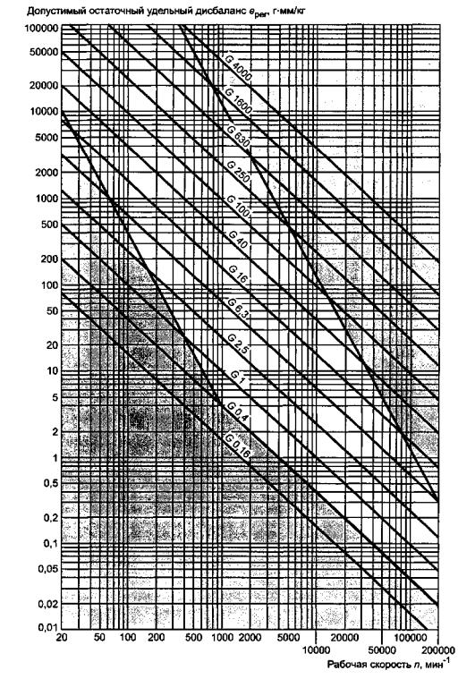Для класса точности балансировки - G 6,3 (см. график на рисунке Е.1, взятый из ГОСТ ИСО 1940-1) максимально допустимое значение удельного дисбаланса eper для частоты вращения 1800 мин-1 (30 с-1) равно 32 мкм.