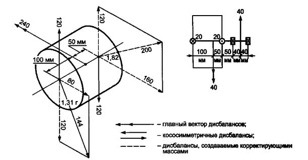Для устранения моментной неуравновешенности в каждой плоскости коррекции размещают корректирующие массы, создающие пару кососимметричных дисбалансов по 120 г·мм и направленные противоположно кососимметричным дисбалансам начальной моментной неуравновешенности.