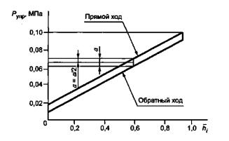 ΔРисп - перепад давления на клапане при проведении испытаний кгс/см2; ρ - плотность пробного вещества, г/см3. 9.11.9 Допускается испытания на герметичность затвора проводить воздухом давлением 0,4 МПа (4 кгс/см2), если в КД не указано иное. Значения допускаемого пропуска воздуха в затворе при ΔРисп = 0,4 МПа (4 кгс/см2) для значений δзат, указанных в ГОСТ 23866, приведены в приложении Г. Если испытание проводят воздухом другим давлением, то значение допускаемого пропуска воздуха в затворе должно быть указано в КД на конкретные клапаны. 9.11.10 Методы контроля: - при испытании водой - объемный или капельный; - при испытании воздухом - объемный или пузырьковый, путем отвода из полости трубки или насадки в емкость с водой на глубину (6 ± 2) мм. 9.11.11 Методику испытаний на определение герметичности затвора клапанов, предназначенных для нефтепродуктов, разрабатывает изготовитель клапанов по согласованию с разработчиком. 9.12 Испытания на нечувствительность 9.12.1 Испытания на нечувствительность проводят на клапанах с пневматическими исполнительными механизмами. Воздух подают непосредственно в исполнительный механизм, рабочую среду в клапан не подают. 1) Воздух подают в исполнительный механизм. 2) Для произвольных значений относительного хода 3) По полученным данным строят график зависимости 4) Рассчитывают нечувствительность, равную а/2. 9.12.2 Пример определения нечувствительности для клапана НО с перестановочным диапазоном исполнительного механизма от 0,02 до 0,1 МПа (от 0,2 до 1,0 кгс/см2) приведен на рисунке 1.