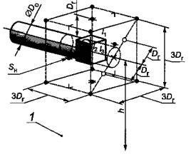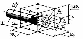 1 - звукоотражающий пол или стена; S - площадь измерительной поверхности, м2: S = 9Dr2 + 12Dr(h + 1,5Dr) - SH, • - 15 точек измерений; X - дополнительная точка для измерений у входного отверстия; O - дополнительные точки для измерений у выходного отверстия, расположенные на диагонали, как показано на рисунке d) Излучение из воздуховода при 1,5 Dг<h<4,5 Dг Рисунок 1 - Положения точек измерений на измерительной поверхности в форме прямоугольного параллелепипеда, лист 1