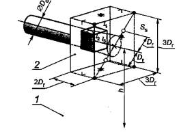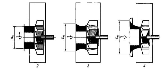 1 - направление воздушного потока; 2 - цилиндрический вход; 3 - конический вход; 4 - раструбный вход Рисунок 6 - Номинальный диаметр входа вентилятора в звукоотражающей плоскости DN для различных конструкций вентилятора Точки измерений распределены вдоль линий с углом полуконуса 33°, 60°, 80° (три эквивалентные зоны). Измерения выполняют в шести точках: - в точках 1, 2 и 4 или 2, 5 и 6 в горизонтальной плоскости, в зависимости от того, что удобнее; - в точках 7, 8 и 9 в вертикальной плоскости. 5 Метод испытанийВо время испытаний периодически измеряют температуру и давление окружающей среды. Частоту вращения (с точностью до 1 %) и расход определяют и поддерживают постоянными для любой точки рабочей характеристики. Частота вращения вентилятора не должна отличаться от заданной более чем на 5 %, чтобы снизить до минимума изменение уровня звуковой мощности, если применяют преобразование результатов испытаний по закону подобия. Если работа вентилятора невозможна с указанной точностью частоты вращения, то проводят испытания на испытательной частоте вращения и пересчитывают результаты на заданную или номинальную частоту вращения. Для построения графика уровней звуковой мощности в зависимости от расхода испытания проводят на разных режимах работы вентилятора. Измерение расхода предпочтительно методом определения рабочей точки на характеристике вентилятора. Расход в рабочей точке иногда определяют косвенным образом по статическому или полному давлению вентилятора. Давление определяют по ГОСТ 10921-90. Допускается неопределенность определения рабочей точки при измерении уровня шума вентилятора 5 % при 95% -ном уровне доверия. Для выбора рабочей точки на характеристике вентилятора используют дросселирующее устройство. Уровень звукового давления, генерируемого дросселирующим устройством и средствами измерения расхода, в любой точке измерительной поверхности должен быть по меньшей мере на 10 дБ ниже измеренного уровня шума испытуемого вентилятора. Чтобы обеспечить этот критерий, концевое поглощающее устройство должно быть эффективным во всех третьоктавных полосах диапазона частот измерений. 6 Определение уровня звуковой мощности6.1.1 Расчет уровня звукового давления на поверхности Для измерительной поверхности в форме прямоугольного параллелепипеда или малой полусферы (см. рисунки 1 - 5) уровень звукового давления на поверхности Lp ,дБ, рассчитывают по формуле