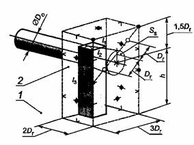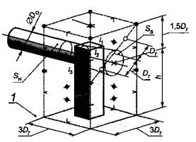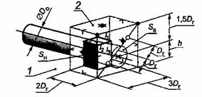 1 - звукоотражающий пол или стена; 2 - звукоотражающая плоскость; S - площадь измерительной поверхности, м2: S = 6Dr2 + 7Dr(h + 1,5Dr), • -10 точек измерений; X - дополнительная точка для измерений у входного отверстия; O - дополнительные точки для измерений у выходного отверстия, расположенные на диагонали, как показано на рисунке с) Излучение из отверстия в стене при 1,5Dr < h < 4,5Dr