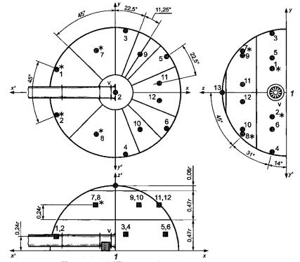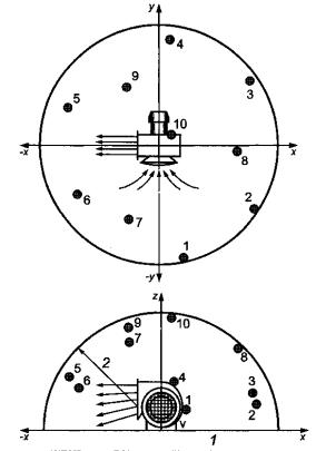 При компоновке типов В и С 13 точек измерений распределяют на полусфере. Оси декартовых координат должны быть направлены так, чтобы свободный вход или выход были ориентированы по положительному направлению оси х, а ось z- перпендикулярна к звукоотражающей плоскости. Точки измерений приведены на рисунке 3, а их координаты указаны в таблице 3. 1 - звукоотражающая плоскость