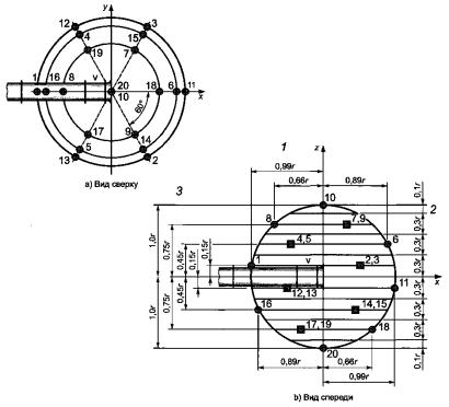 4.4.4.2 Сферическая измерительная поверхность 20 точек измерений распределяют по сферической поверхности. Оси декартовых координат должны быть направлены так, чтобы свободный вход или выход были ориентированы по положительному направлению оси х, а ось z - была вертикальна. Точки измерений приведены на рисунке 4, а их координаты указаны в таблице 4. 1 - горизонтальные расстояния от оси z до микрофона; 2 - вертикальный размер соответствующих сегментов сферы; 3 - высоты точек измерения; r - радиус сферы;