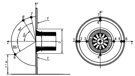 4.5 Положения точек измерений на малой полусфереДля каждого входа испытуемого вентилятора задают измерительную поверхность. Если имеется несколько входов, то измерительные поверхности не должны перекрываться. Кроме того, они должны быть таковы, чтобы измерения в любой точке на поверхности, соответствующей входу, не влияли отрицательно на излучаемую другим входом или выходами звуковую мощность. Измерительная поверхность является полусферой, центр которой расположен на пересечении оси симметрии каждого входа и плоскости, перпендикулярной к этой оси. Полусфера расположена выше по течению потока относительно входа (см. рисунки 5 и 6). Радиус полусферы r, м, рассчитывают по формуле r = 1 +0,5DN, где DN - номинальный диаметр входа вентилятора в звукоотражающей плоскости, м. (см. рисунки 5 и 6). Площадь измерительной поверхности S = 2πr2, м2. Координаты точек измерений указаны в таблице 5. 1 - звукоотражающая плоскость Рисунок 5 - Координаты точек измерений (см. таблицу 5) Таблица 5 - Координаты точек измерений