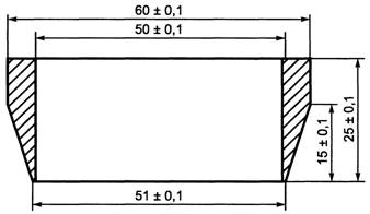 где m1 - масса сухого образца, кг; m2 - масса образца после насыщения водой, кг; S - площадь увлажняемой грани образца, м2; Кw - коэффициент, учитывающий время насыщения образца и равный За результат испытания принимают среднеарифметическое значение результатов испытания трех образцов, округленное до 0,1 кг/(м2∙ч0,5). 6 Определение прочности сцепления (адгезии) раствора (бетона) с основанием6.1 Прочность сцепления (адгезию) с основанием определяют для затвердевших растворов и мелкозернистых бетонов. 6.2 Прочность сцепления (адгезию) определяют по силе отрыва образца затвердевшего раствора (бетона) от основания - бетонной плиты, приложенной к образцу через металлический диск с анкером (далее - штамп), приклеенный к поверхности образца. В зависимости от области применения смесей в качестве основания могут применяться: кирпич, природный камень, плита из минеральной ваты, пенополистирол, керамическая плитка и др. при условии выполнения требований настоящего стандарта. Примечание - Метод определения прочности сцепления растворов (бетонов) с бетонным основанием применяют как основной (арбитражный). 6.3 Средства испытания и вспомогательные устройства Основание - бетонная плита в соответствии с требованиями, приведенными в 6.4, или плиты из других материалов размерами по 6.4 и физико-механическими показателями, установленными в нормативных или технических документах на смеси конкретных видов. Трафарет из нержавеющей стали толщиной Допускается изготавливать трафарет из другого материала, обеспечивающего жесткость трафарета и не поглощающего воду из смеси. Металлический шпатель. Штамп круглый диаметром Усеченное коническое кольцо с острыми краями, внутренним диаметром (50,0 ± 0,1) мм и высотой (25,0 ± 0,5) мм, изготовленное из нержавеющей стали или латуни (см. рисунок 3). Эпоксидный или другой быстротвердеющий клей высокой прочности для приклеивания штампа к слою раствора. Камера, обеспечивающая твердение образцов при температуре (20 ± 2)°С и относительной влажности воздуха (65 ± 5) %. Пресс с устройством для захвата анкера или другое средство измерения, обеспечивающее равномерную скорость нагружения (250 ± 50) Н/с.