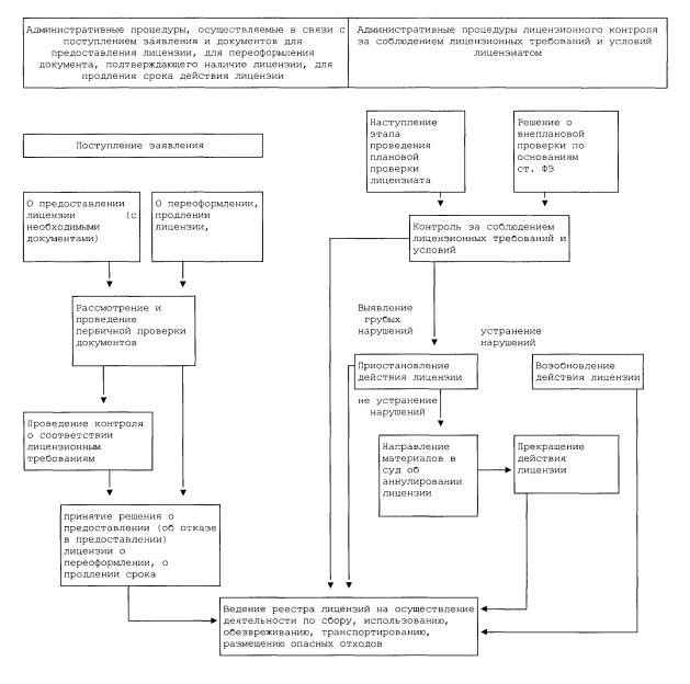 положения законодательства Российской Федерации, регламентирующие порядок лицензирования деятельности по сбору, использованию, обезвреживанию, транспортировке, размещению опасных отходов, а также блок-схемы порядка лицензирования и выполнения административных процедур в рамках лицензирования данной деятельности с указанием ответственных должностных лиц, содержания, последовательности и сроков исполнения административных действий;