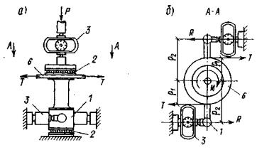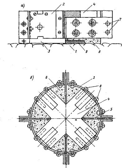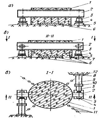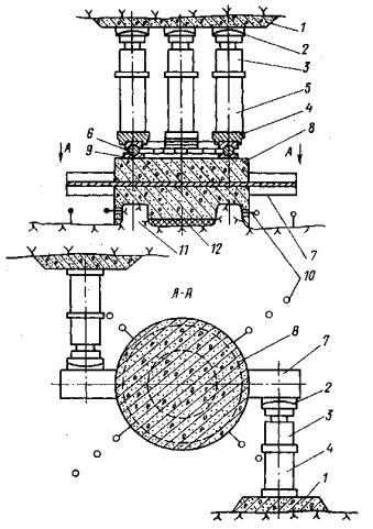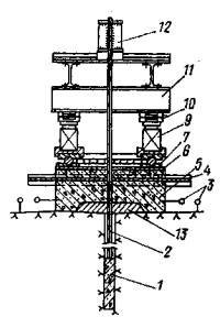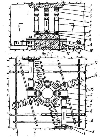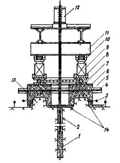 4.4. С целью получения полных данных о реологических свойствах исследуемой разности породы в мерзлом или оттаявшем состоянии при различных напряженных состояниях количество опытов надлежит принимать не менее пяти (без учета повторности). В программу испытаний должны быть включены следующие опыты - на растяжение (отрыв), на кручение при растяжении, на кручение без нормальной нагрузки и два опыта на кручение при различных нормальных сжимающих нагрузках. Общее количество опытов на строительной площадке и величину максимального нормального напряжения в опытах следует определять в каждом конкретном случае, исходя из инженерно-геологической обстановки и типа сооружения. Руководствуясь указаниями СНиП 2.02.02-85, опыты должны проводиться с трехкратной повторяемостью. 4.5. Конструкции установок для проведения полевых опытов должны обеспечивать нормальные и касательные нагрузки на основание ступенями давления 0,1 ÷ 0,5 МПа (1 ÷ 5 кг/см2) центральную передачу усилий на целик (штамп), постоянство во времени каждой ступени давления; замер перемещений поверхности массива с точностью 1·10-5 ÷ 1·10-6 м, используя стандартные индикаторы часового типа с точностью 0,01 мм и 0,001 ÷ 0,002 мм. Конструктивная схема установки может быть принята различной в зависимости от наличия оборудования и местных условий. Конструктивную схему установки, представленную на рис. 2 и 3, следует использовать при испытаниях в специальных подземных камерах размером в плане 4 × 4 м и высотой 2,5 м. Для испытаний в камерах больших размеров по высоте и на открытых площадках следует применять схемы, представленные на рис. 4 и 5. Для проведения испытаний на растяжение (отрыв) или на сдвиг кручением при растяжении следует применять конструкцию установки, представленную на рис. 6. Нагрузочные гидравлические системы установки должны быть оборудованы автоматической системой поддержания постоянного давления.