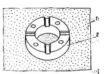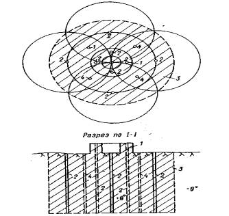 Рис. 7. Схема глубинного отогрева массива 1 - кольцевой целик или кольцевой бетонный штамп; 2 - скважина с глубинным теплоэлектронагревателем (ТЭН); 3 - зона оттаявшего массива; 4 - температурные скважины. В специальных скважинах датчики, смонтированные в связи через 10 см и установленные в шпур (скважину), должны быть по всей глубине тщательно гидроизолированы глинистым грунтом, чтобы предотвратить попадание воды, образующейся при оттаивании породы. Результаты температурных замеров заносятся в журналы наблюдений. 4.11. Конструктивная схема лабораторной установки для испытания монолитов скальных и полускальных грунтов в мерзлом и оттаявшем состоянии представлена на рис. 8. Максимальный размер монолита в плане 0,50×0,50 м. Исследуемый монолит породы помещается в секционный лоток, устанавливаемый на станине установки. Жесткое закрепление монолита в лотке достигается путем погружения его в цементно-песчаную оболочку. На рабочей поверхности монолита выполняется кольцевой целик или кольцевой бетонный штамп заданных размеров в плане. При проведении опытов на схеме (рис. 1, а, б) приложение нормального сжимающего или касательного напряжения на рабочую поверхность монолита осуществляется при помощи рычажно-гидравлических систем. Нагрузочные системы стенда обеспечивают создание на контакте целика или штампа (с рабочей кольцевой площадью 50 см2) с основанием нормальных напряжений до 5 МПа (50 кг/см2) и касательных напряжений до 15 МПа (150 кг/см2). Указания по тарировке нагрузочных систем стенда даны в приложении 3.