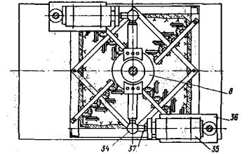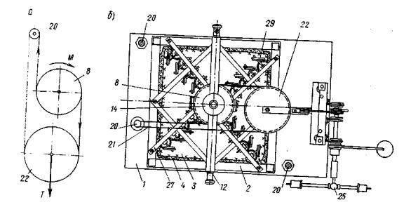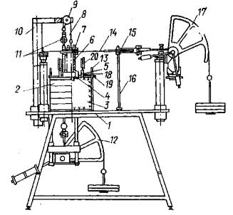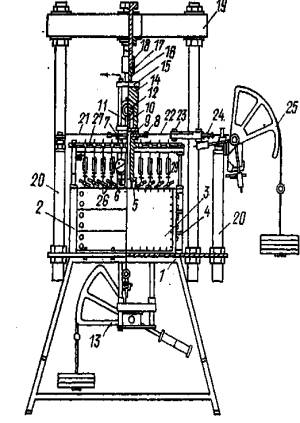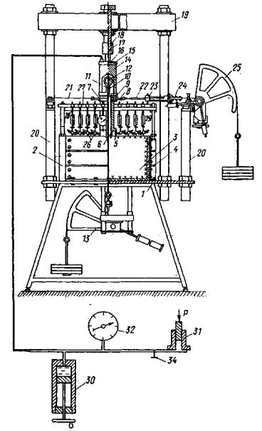 Рис. 8. Конструкция стенда для испытания монолитов скальных и полускальных грунтов методом кольцевого нагружения 1 - станина; 2 - секционный лоток; 3 - монолит породы; 4 - бетонная оболочка; 5 - кольцевой целик или кольцевой бетонный штамп; 6 - металлическое кольцо; 7 - переходный цилиндр; 8 - диск кручения; 9 - упорный подшипник; 10 - штамп; 11 - шарик; 12 - нагрузочная рама; 13 - рычаг приложения нормальной нагрузки; 14 - цилиндр; 15 - гидравлическая камера; 16 - крышка; 17 - переходник; 18 - упорный винт; 19 - упорная рама; 20 - стойки; 21 - трос; 22 - распределительный диск горизонтального усилия; 23 - ось; 24 - вилка; 25 - рычаг приложения крутящего момента; 26 - реперы; 27 - измерительная рама; 28 - держатель индикатора; 29 - индикаторы часового типа.