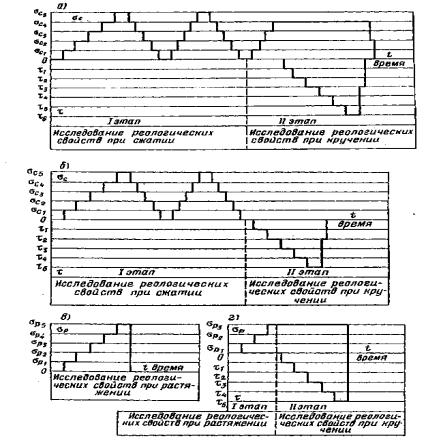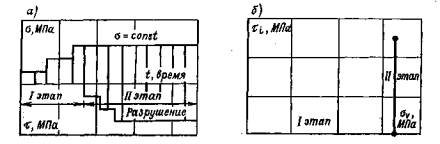 Рис. 10. Программы изменения нормальных и касательных напряжений при проведении опытов. Изменение интенсивности давления между ступенями при отсутствии специальных требований следует производить со скоростью не более 0,5 МПа в 1 мин. Примечания. 1. При проведении опытов на растяжение допускается разбивка интервала нагружения на 2-3 ступени. 2. Рекомендуется назначать программу нагружения в полевых опытах на основе результатов лабораторных испытаний монолитов МКН. 3. Величина ступени нагружения не должна превышать 1,0 МПа при действии нормальной нагрузки и 0,5 МПа при действии касательной нагрузки. 5.3. Разгрузку рекомендуется производить теми же ступенями, что и принятыми в режиме нагружения. 5.4. Расчет величины среднего нормального напряжения σ на контакте целика (штампа) с основанием производится по зависимости