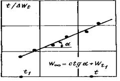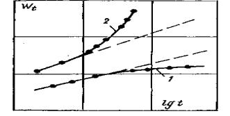 При затухающем характере развития деформаций во времени на ступени нагружения (кривая 1, рис. 11) выполняется построение графика в осях t – t1/ΔWt - t (рис. 12), где ΔWt = Wt – Wt1; Wt - перемещение штампа (целика) в момент времени t; Wt1 - перемещение в момент времени t1 = 2 ÷ 3 ч с момента нагружения (разгрузки) ступени давления. В зависимости от программы опытов под величиной Wt на рис. 11 и 12 условно подразумевается осадка, подъем или горизонтальное (угловое) перемещение поверхности массива. В данном случае выдерживание на ступени постоянного давления считается законченным, если отношение (W¥ - Wt)/W¥ не превышает 0,1, где W¥ - стабилизированная величина перемещения при времени выдерживания постоянного давления на ступени, стремящемся к бесконечности, т.е. ставится условие, чтобы замеренное в опыте перемещение отличалось от перемещения, соответствующего полной стабилизации, не более чем на 10 процентов. При незатухающем характере развития деформаций во времени (кривая 2, рис. 11) выдерживание на ступени считается законченным, если при трех последующих двухчасовых отсчетах сохраняется вид зависимости 2 на рис. 11. Примечания. 1. С целью сокращения общего времени проведения полевых опытов, критерии стабилизации следует уточнять на основе выполнения опытов в лабораторных условиях по результатам испытания монолитов пород, отобранных из областей массива, максимально приближенных к местам проведения полевых испытаний. 2. Следует в процессе приложения кольцевой касательной нагрузки анализ горизонтальных (угловых) перемещений штампа (целика) во времени дополнять анализом вертикальных перемещений массива (рис. 13). Как правило, при затухающем характере развития горизонтальных (угловых) перемещений наблюдается осадка поверхности массива во времени (кривая 1, рис. 13), а при незатухающем - подъем поверхности основания (кривая 2, рис. 13). 3. Wt в момент времени t определяется как средняя величина перемещения штампа (целика), зафиксированная по реперам, расположенным на штампе (целике). Величина перемещения Wt на расстоянии r от штампа (целика) определяется как средняя величина перемещений реперов, расположенных на расстоянии r от штампа (целика).