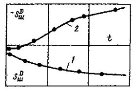 Рис. 13. Зависимости дополнительной осадки (подъема) поверхности основания от величины касательного напряжения 1 - при затухающей ползучести; 2 - при незатухающей ползучести. 5.9. После достижения предельного сопротивления сдвигу (срезу) опыт необходимо продолжать для определения величины сдвигающего усилия, которое характеризует остаточное сопротивление сдвигу по образовавшейся трещине. Момент достижения остаточного сопротивления породы сдвигу рекомендуется определять по графику смещений целика (штампа).