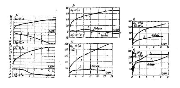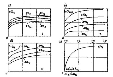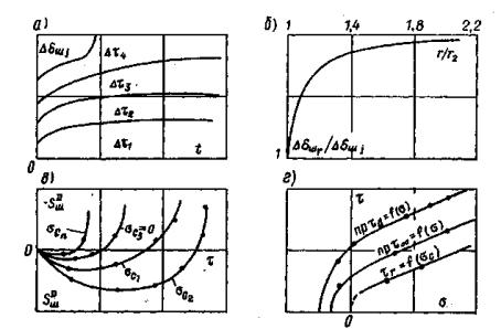 Рис. 14. Программа изменения нормальных и касательных напряжений при повторных сдвигах кольцевого целика (штампа) по образовавшейся после среза трещине 5.10. Рекомендуется в каждом опыте выполнять повторные испытания сопротивляемости сдвигу пород по образовавшейся в результате первого опыта зоне разрушения (трещине) - остаточного сопротивления сдвигу. Испытания необходимо выполнять при нескольких (минимум трех) различных нормальных напряжениях (σ', σ", σ"'). Режим изменения нормальных и касательных напряжений при сдвиге приведен на рис. 14. По окончании каждого опыта на сдвиг допускается возвращать целик (штамп) в исходное положение после его полной разгрузки и повторять испытание. 5.11. Необходимо, чтобы опыты по определению предельного сопротивления сдвигу проводились при различных нормальных напряжениях (минимум трех), а сопротивление сдвигу по образовавшейся трещине (остаточное сопротивление сдвигу) при проведении повторных опытов на каждом целике (штампе) при совпадающих по величине нормальных напряжениях. 5.12. В случае, если массив в период эксплуатации сооружения будет находиться в водонасыщенном состоянии, при испытании его после оттаивания породу следует подвергать в течение 3-6 суток предварительному смачиванию водой. 5.13. Опыты на целиках (штампах) следует выполнять после набора бетоном проектной прочности и стабилизации температурного поля в основании. 5.14. После проведения испытаний целики (штампы) рекомендуется переворачивать с целью анализа характера разрушения породы. При этом рекомендуется производить микротопографическую съемку рельефа поверхности разрушения с зарисовкой трещин или ослабленных прослоек, состава заполнителя трещин и его физико-механического состава, определения льдистости. 6. ОБРАБОТКА РЕЗУЛЬТАТОВ ИСПЫТАНИЙ6.1. Результаты обработки опытов представляются в табличной и графической форме по ступеням нагружения Δσсj, Δσpj, Δτj, разгрузки Δσвj, Δτвj для каждого вида и цикла испытания с целью последующей их обработки и интерпретации. 6.2. По данным, полученным при нагружении массива нормальной нагрузкой (сжимающей или растягивающей), для каждой ступени нагружения Δσj и разгрузки Δσвj строятся зависимости осадки S (подъема U) поверхности исследуемого массива от времени (кривые ползучести) по осредненным перемещениям реперов, установленных на целике (штампе) (рис. 15, а, б, в), а также осадка (подъем) поверхности массива вокруг целика (штампа) в относительных координатах для стабилизированного состояния (рис. 15, г). Примечание. Изложенная ниже методика определения параметров ползучести при нагружении массива нормальной сжимающей нагрузкой может быть непосредственно перенесена на проведение испытаний пород сплошным штампом круглой формы в плане (т.е. при соотношении параметра ξ = r1/r2 = 0). При проведении опытов квадратным штампом для использования методики обработки опытных данных и определения параметров ползучести необходимо привести его к равновеликому по площади сплошному круглому штампу.