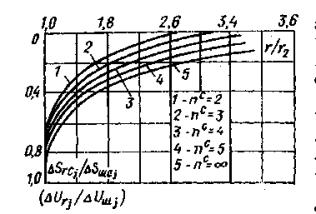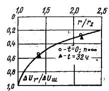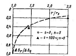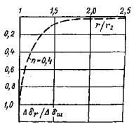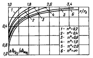 где ωk - табличный коэффициент (табл. 2), зависящий от соотношения ξ = r1/r2 размеров активной зоны деформирования при кручении Hкa (толщина слоя); Δδш0j - условно-мгновенное горизонтальное (угловое) перемещение внешнего контура (при r1 = r2) кольцевого целика (штампа), соответствующее ступени нагружения Δτj. 6.17. В том случае, если в опыте принято соотношение ξj = r1/r2 целика (штампа), отличающееся от имеющихся значений в табл. 2, величина ωk определяется по зависимости ωk = ωTk (1 – ξ4i)/(1 – ξ4T), (14) где ωTk - табличное значение коэффициента для ξт. 6.18. При интерпретации результатов опытов за расчетную принимается величина Hка, для которой теоретическая и экспериментально полученная формы перемещений поверхности породы достигают наилучшего совпадения. Для этой цели используется номограмма перемещений поверхности основания, построенная в относительных координатах по данным табл. 2 (рис. 21), на которую наносятся экспериментальные точки (см. приложение 5). 6.19. Определение параметров ползучести по результатам экспериментов на каждой ступени нагружения при затухающей во времени деформации выполняется по зависимости