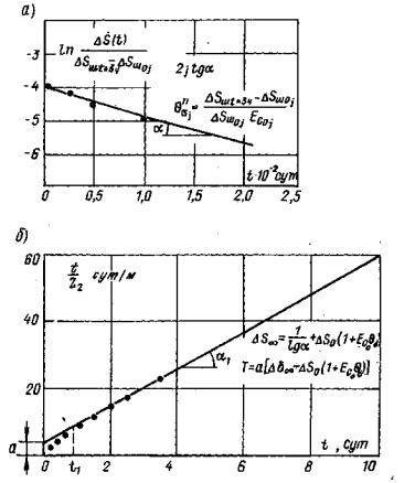 6.10. Параметры ползучести θПσj и λσj. определяются по начальному участку (до 3-4 ч с момента нагружения ступени) кривой ползучести графически (рис. 18, а), а параметр Tσj, и величина осадки ΔS¥j при t ® ¥ определяются по графику (рис. 18, б). Параметр E¥j определяется по зависимости