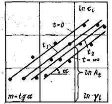 Рис. 26. Зависимости γi = f (τit) в логарифмических координатах. Так как при совместном действии кольцевой нормальной и касательной нагрузок в основании создается напряженное состояние, характеризуемое параметром вида напряженного состояния μσ = (2σ2 – σ1 – σ3)/(σ1 – σ3) = 0, то полученные зависимости γi = f (τ, t) являются зависимостями между τi и γit (рис. 25) [7]. Рекомендуется степенная аппроксимация зависимостей γi (t) = f (τi; t) в следующем виде: γi (t) = (τi/At)1/m, (29) где А - параметр деформируемости, переменный во времени; m ≤ 1 - коэффициент упрочнения. 6.32. Величина параметра At для различных моментов времени и коэффициент m определяются на основе построения зависимости γi (t) = f (τi; t) в логарифмических координатах (рис. 26). Примечание. Определение параметров At и m для конкретного момента времени t выполняется методом наименьших квадратов из решения системы двух уравнений: