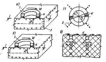 Примечание. В том случае, если зависимости Ec0 = f (σс) и Еc¥ = f (σс) во всем исследованном интервале действия σс близки к линейным, параметры Еc0, Еc¥, θσ, λσ Тσ определяются по осредненной кривой ползучести (см. приложение 5). 6.15. По данным, полученным при нагружении массива кольцевой касательной нагрузкой, определяются значения условно-мгновенного модуля сдвига G0j,- по ступеням нагружения. В качестве расчетной используется модель основания в виде линейно деформируемого слоя ограниченной толщины.