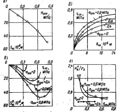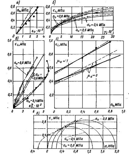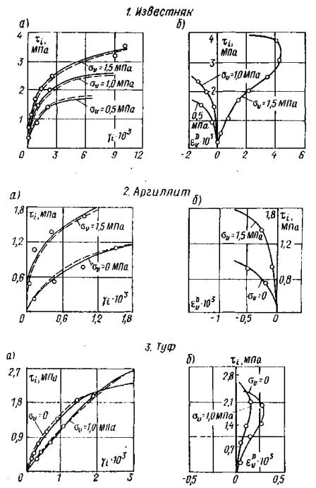 На рис. 5, г нанесены зависимости пр τi = f (σv), построенные по параметрам tg φокт и Сокт, определенным по формулам (15) и (19) при φм = 27°30' и См = 0,4 МПа. Сопоставление показывает, что они достаточно близки к зависимостям, полученным в экспериментах.