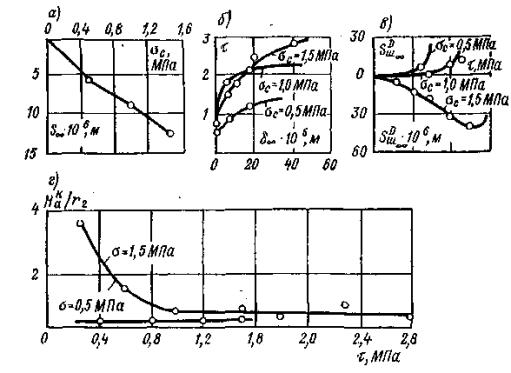 Рис. 15. Графики зависимости перемещений поверхности массива во времени от действия нормальной кольцевой нагрузки: а) при сжатии; б) при разгрузке; в) при растяжении; г) за пределами кольцевой нагрузки. Рис. 16. Графики зависимости перемещений поверхности массива во времени от действия кольцевой касательной нагрузки и сопротивления сдвигу: а) кривые ползучести; б) за пределами действия кольцевой нагрузки; в) вертикальных перемещений; г) зависимости сопротивления сколу и сдвигу. 6.3. По данным, полученным при нагружении массива кольцевой касательной нагрузкой, строятся кривые ползучести для каждой ступени Δτj (рис. 16, а), зависимости горизонтальных (угловых) перемещений поверхности основания вокруг целика (штампа) для стабилизированного состояния tст в относительных координатах (рис. 16, б), зависимости стабилизированной осадки (подъема) поверхности основания целика (штампа) от касательного напряжения т, полученные при различных нормальных напряжениях (рис. 16, в). 6.4. По данным, полученным при нагружении массива кольцевой нормальной нагрузкой; определяется значение условно-мгновенного модуля деформации при нагружении Ес0 по ступеням. В качестве расчетной используется модель основания в виде линейно-деформируемого слоя ограниченной толщины [21, 22]. Таблица 1 Таблица значений коэффициента ωс