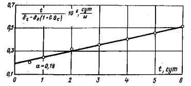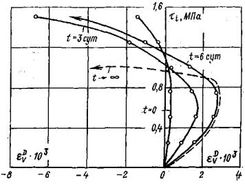 где Ko0 - условно-мгновенное значение коэффициента удельного отпора, МПа/м; Ko¥ - стабилизированные значения коэффициента отпора при t ® ¥. Примечание. Примеры расчета напряженного состояния обделок напорных туннелей с учетом ползучести даны на стр. 251-257 [44]. 6.36. При нелинейной зависимости γit = f (τi, t) (см. п. 6.31) величину коэффициента удельного отпора Ко и его изменение во времени Коt при постоянном давлении в туннеле следует определять по формуле: