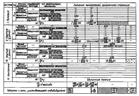 12. Все трещины и зоны, учитываемые индивидуально, наносятся на графики сводного листа особыми знаками. Для количественной оценки криогенного строения в их пределах необходимы специальные исследования (лабораторные, натурные). Места проведения таких работ отражаются на зарисовке условными знаками. Обработка материалов этих исследований и их результаты представляются дополнительно.