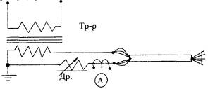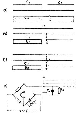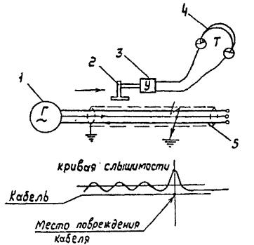 а, б, в) Виды повреждений кабелей; г) Схема для определения емкости Рисунок 11.1 Измерение емкости можно производить мостом переменного тока (рис. 11.1г) с питанием от генератора 1000 Гц, 10-20 В·А. Контроль баланса моста производится телефоном. Емкостной метод определяет приближенно место повреждения кабеля. Для более точного определения места повреждения кабеля непосредственно на трассе используют индукционный метод, который основан на принципе прослушивания с поверхности земли с помощью телефонных трубок звука, создаваемого магнитным полем, в результате протекания по жилам кабеля тока тональной частоты. Для создания магнитного поля при применении индукционного метода собирается схема по рис. 11.2.