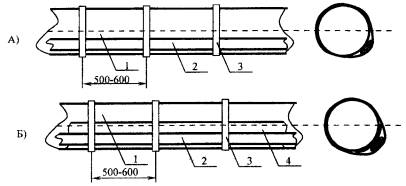 А) прокладка кабеля по металлической трубе; Б) прокладка кабеля по пластмассовой трубе 1 - труба; 2 - нагревательный кабель; 3 - поясок из ленты с липким слоем (2-3 витка); 4 - лента алюминиевая с липким слоем Рис. 8.8.1 Крепление нагревательного кабеля к трубе При прокладке нагревательного кабеля по пластмассовой трубе предварительно на трубу наклеивается алюминиевая лента. Крепление нагревательного кабеля к металлической трубе может быть произведено приклейкой его алюминиевой лентой поверх кабеля вдоль оси кабеля. Такой вариант несколько дороже, но обеспечивает лучшую теплопередачу от кабеля к трубе, что обеспечивает большую мощность теплоотдачи саморегулирующимися греющими кабелями. К плоским металлическим поверхностям, например, к внутренней облицовке обогреваемого шкафа, кабель крепится алюминиевой лентой с липким слоем. В качестве примеров приводится следующая информация о крепежных лентах. Фирма Raychem: GT-66 - Крепежная лента из стеклоткани для труб из углеродистой стали: максимальная температура воздействия 130 °С; минимальная температура монтажа 5 °С; ширина ленты 12 мм. GS-54 - Крепежная лента из стеклоткани для труб из нержавеющей и углеродистой стали: максимальная температура воздействия 180 °С; минимальная температура монтажа -40 °С; ширина ленты 12 мм. ATE-180 - Крепежная лента из алюминиевой фольги для труб и емкостей из углеродистой и нержавеющей стали: максимальная температура воздействия от минус 54 до 149 °С; минимальная температура монтажа 0 °С; ширина ленты 50 мм. Ленты других производителей: FT/HTP - лента самоклеящаяся крепежная поливинилхлоридная: максимальная температура воздействия 70 °С; минимальная температура монтажа 0 °С; ширина ленты 12 мм. FT/HTP - лента самоклеящаяся крепежная стекловолоконная: максимальная температура воздействия 135 °С; минимальная температура монтажа 0 °С; ширина ленты 12 мм. ЛАС - лента алюминиевая самоклеящаяся крепежная: максимальная температура воздействия 110 °С; минимальная температура монтажа 0 °С; ширина ленты 50 мм. 8.9 Механизация прокладки проводов и кабелей8.9.1 Механизация работ достигается путем максимальной замены ручного труда за счет переноса отдельных операций по монтажу, разделке и оконцеванию жил проводов и кабелей в мастерские, оборудованные соответствующими механизированными линиями (заготовка пучков проводов, прокладываемых в трубах, жгутовка проводов, прокладываемых на лотках и коробах, разделка кабелей, установка штепсельных разъемов и др.), а также механизация прокладки электрических проводок непосредственно на строящемся объекте. 8.9.2 Средства механизации работ в мастерских проектируются, как правило, индивидуально и в настоящем материале не описываются. 8.9.3 Средства механизации работ по прокладке электрических проводок на стройплощадке. Средства механизации при прокладке кабелей с барабана, установленного стационарно на кабельных домкратах, с применением лебедок. Раскатку и прокладку кабеля осуществляют при помощи тяговых лебедок с применением дополнительных средств механизации (кабельных раскаточных роликов и др. приспособлений), обеспечивающих уменьшение усилий тяжения и предохраняющих кабель от повреждения. К сожалению, средства механизации для прокладки кабелей по кабельным конструкциям и при затяжке в трубы Новокузнецкий опытный завод монтажных механизмов 