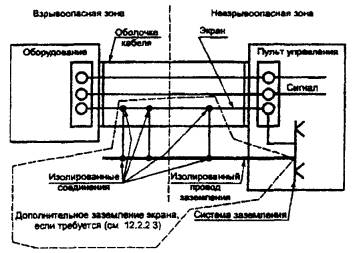 Рисунок 2 - Заземление проводящих экранов - изолированный заземляющий проводник имеет достаточное поперечное сечение (как правило, не менее 4 мм2, а для соединений с помощью зажимов может быть более подходящим поперечное сечение 16 мм2); - устройство изолированных заземляющего проводника и экрана способно выдержать испытание напряжением 500 В между всеми другими проводниками в кабеле и броней кабеля; - изолированные заземляющий проводник и экран соединены с заземлителем только в одной точке, которая является одной и той же как для изолированного заземляющего проводника, так и для экрана, и расположена в конце кабеля, находящегося вне взрывоопасной зоны; - изолированный заземляющий проводник удовлетворяет требованиям 9.1.1; - отношение индуктивности к сопротивлению (L / R) кабеля, проложенного вместе с изолированным заземляющим проводником, определено и показано соответствие требованиям 12.2.5; b) если электроустановка функционирует и обслуживается таким образом, что существует высокая степень уверенности в наличии уравнивания потенциалов между концами цепи, находящимися во взрывоопасной зоне и вне ее, тогда, если это необходимо, экраны кабеля могут быть соединены с заземлителем на каждом конце кабеля и, если требуется, в любых промежуточных точках; c) допускается заземление в нескольких точках через конденсаторы малой емкости (например, керамические: 1 нФ, 1500 В), если результирующая емкость не превышает 10 нФ. -12.2.2.4 Соединение кабельной брони Броня должна, как правило, подсоединяться к системе уравнивания потенциалов через устройства кабельного ввода или эквивалентным способом на каждом конце трассы кабеля. Там, где установлены промежуточные распределительные коробки или другое электрооборудование, броня в этих точках должна, как правило, также подсоединяться к системе уравнивания потенциалов. В случаях, когда броня не должна подсоединяться к системе уравнивания потенциалов ни в одной из промежуточных точек кабеля, должны быть предприняты меры предосторожности, гарантирующие, что электрическая целостность брони поддерживается по всей длине трассы кабеля. Там, где подсоединение брони в точке ввода кабеля невозможно или где требования проекта этого не допускают, должны быть предприняты меры, предотвращающие возникновение разности потенциалов между броней и системой уравнивания потенциалов, способной вызывать воспламеняющую искру. В любом случае должно иметься по крайней мере одно электрическое соединение брони системой уравнивания потенциалов. Кабельный ввод для отделения брони от земли должен быть установлен вне взрывоопасной зоны или в зоне класса 2. Электроустановки с искробезопасными электрическими цепями должны быть смонтированы таким образом, чтобы на их искробезопасность не оказывали неблагоприятное воздействие внешние электрические или магнитные поля, например, от близлежащих воздушных линий электропередач или сильноточных одножильных кабелей. Это может быть достигнуто, например, использованием экранов и (или) изгибом жил или обеспечением требуемого удаления от источника электрического или магнитного поля. В дополнение к требованиям 9.1.1 кабели как во взрывоопасной зоне, так и вне ее должны отвечать одному из следующих требований: a) кабели искробезопасных электрических цепей должны быть отделены от 