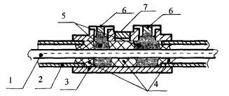 1 - провода, кабель; 2 - защитная труба; 3 - корпус коробки локального уплотнения; 4 - волокнистый заполнитель; 5 - кабельная мастика; 6 - пробки для запивки мастики; 7 - пробка для испытания уплотнения коробки Рисунок 9.2 9.2.3.12 В пожароопасных зонах в тонкостенных электросварных трубах допускается прокладка медных проводов сечением до 3 мм2 и алюминиевых - до 5 мм2. При прокладке проводов и кабелей в стальных защитных трубах с сечением жил выше указанного недопустимо применение протяжных коробок и стальных защитных труб с толщиной стенки менее 2,5 мм. 9.2.3.13 Применяемые в пожароопасных зонах соединительные и протяжные коробки должны быть рассчитаны на установку в этих зонах, о чем должно иметься указание в паспорте или технических условиях на эти изделия. 9.2.3.14 В пожароопасных установках всех классов запрещается применять для выполнения ответвлений: скрутку жил проводов и кабелей без пайки; легкоплавкие припои (сплавы висмут-олово-свинец-кадмий); сжимы в пластмассовых корпусах. 10 Заземление оболочек проводов и кабелейЗаземление металлических (свинцовых или алюминиевых) оболочек и брони кабелей осуществляется при помощи гибких заземляющих проводников путем присоединения их к узлам заземления. Работы по заземлению металлических оболочек и брони выполняются в следующей последовательности: а) произвести обрезку и удаление покрова брони оболочек, наложив бандажи из металлической ленты, как показано на рис. 10.1; б) очистить броню от битумного лака ветошью, смоченной органическими растворителями, и непосредственно перед лужением обезжирить броню и оболочку ацетоном; в) очистить от оксидной пленки металлические поверхности металлической щеткой или другими средствами; г) ленты брони (две смежные) лудят припоем ПОС-30 с канифолью; д) свинцовую оболочку облуживают припоем ПОС-30 с применением в качестве флюса канифоли или стеарина; е) алюминиевую оболочку облуживают в два приема, сначала место пайки облуживается припоем марки «А», а затем припоем ПОС-30. Припой марки «А» растирают нагретым паяльником в течение 25-30 сек (при меньшей продолжительности полуда будет ненадежна). Во избежание перегрева пластмассовых шланговых оболочек и изоляции жил пайку производят не более 3х минут, иначе следует сделать перерывы для промежуточного охлаждения кабеля;