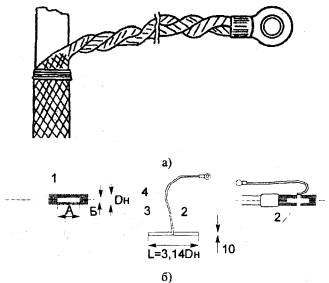 а) с использованием материала оплетки; б) с использованием заземляющего проводника. 1 - площадка, залуживаемая припоем ПОС-30; 2 - места пайки припоем ПОС-30; 3 - полоса стальная; 4 - проводник заземляющий. Рисунок 10.2 Заземление панцирных оплеток кабеля От конца кабеля отмеряют расстояние до места крепления перед сборкой зажимов или до ввода в прибор, разъем и т.п. и на расстоянии 5-10 мм от этой отметки на панцирную оплетку накладывают бандаж из 6-7 витков медной проволоки диаметром 0,4-0,5 мм. Расплетают оплетку от конца кабеля до бандажа, разделяют оплетку на две равные пряди, скручивают каждую прядь в отдельности, а затем обе пряди между собой и устанавливают наконечник по рис. 10.2.а, либо припаивают заземляющий проводник по рис. 10.2.б. Таблица 9 Размеры к рисунку 10.2