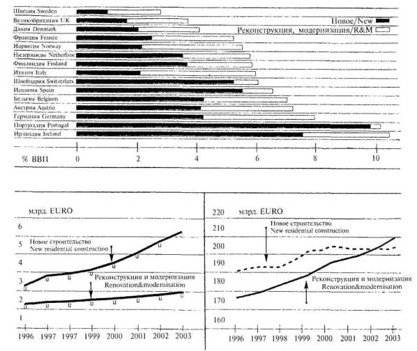 Основная тенденция развития жилищного строительства в Западной Европе состоит в переходе на малоэтажное строительство с жилыми домами на 1-2 семьи и максимальной поддержкой с помощью государственных субсидий. Преимущественное развитие приобретают модернизация и реконструкция. Для стран Восточной Европы преобладающей остается модель опережающего многоэтажного строительства и менее интенсивного процесса восстановления и доведения до современных требований эксплуатируемого жилого фонда*.