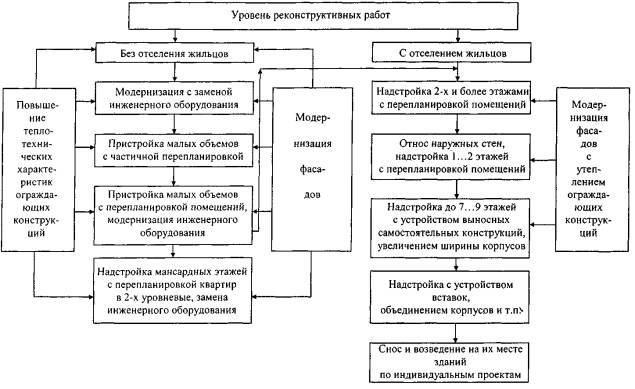 Доля затрат на реконструктивные работы достаточно высока. Эти данные подтверждаются многолетним опытом Скандинавских стран (Швеция - 40 %, Финляндия - 51 %), Центральной Европы (Франция - до 60 %, Германия - 30-40 %, Великобритания - до 60 %). Центр тяжести затрат, как правило, переносится на жилищные объекты как наиболее массовые и в меньшей степени на здания общественного и административного назначения.
