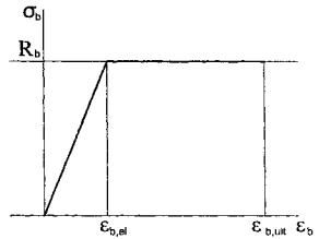 Рис.3 Если принимать во внимание только первый, наклонный участок диаграмм, то условия деформирования для бетона и арматуры запишутся в виде: σb = Eb,red·εb ≤ Rb; σs = Es·εs ≤ Rs, где εb и εs - осевые деформации сжатого бетона и растянутой арматуры; Eb,red - условный, приведенный модуль упругости сжатого бетона; Es - физический модуль упругости растянутой арматуры; Rb и Rs - расчетные сопротивления бетона осевому сжатию и арматуры осевому растяжению. Если принять во внимание только второй, горизонтальный участок диаграмм, то условия деформирования для бетона и арматуры запишутся в виде: σb = Rb; σs = Rs т.е. напряжения в бетоне и арматуре равны расчетным сопротивлениям независимо от их деформаций. Если принимать во внимание диаграммы деформирования бетона и арматуры, в целом состоящие из наклонного и горизонтального участков, то условие деформирования для бетона и арматуры запишется в виде: при 0 ≤ εb ≤ εb,el; σb = Eb,red εb; при εb1 ≤ εb ≤ εb,ult; σb = Rb; при 0 ≤ εs ≤ εs,el; σs = Es εs; при εs1 ≤ εs ≤ εs,ult; σs = Rs, где εs,ult и εb,ult предельные деформации бетона и арматуры; εs,el и εb,el предельные упругие деформации бетона и арматуры. Первая группа условий деформирования определяет условно упругую работу бетона и арматуры. Вторая группа условий деформирования определяет условно пластическую работу бетона и арматуры. Третья группа условий деформирования определяет условно упругопластическую работу бетона и арматуры. Очевидно, для того чтобы использовать условия деформирования бетона и арматуры для определения напряжений в уравнениях равновесия, необходимо установить характер деформирования нормального сечения. Двухлинейные диаграммы определяются двумя параметрическими точками: первой точкой, отвечающей границе упругой работы бетона и арматуры и характеризуемой напряжениями Rb и Rs и, соответственно, деформациями εb,el и εs,el и второй точкой, отвечающей предельному состоянию бетона и арматуры и характеризуемой напряжениями Rb и Rs и, соответственно, деформациями εb,ult и εs,ult. Для бетона предельные деформации εb,ult определяются исходя из опытов на осевое сжатие и составляют примерно 0,002. Однако разрушение бетона у сжатой грани изгибаемых элементов наступает при больших значениях предельных деформаций в связи с имеющимся градиентом деформаций и напряжений по высоте сжатой зоны, которые могут быть приняты равными 0,0035. Величина деформаций бетона εb,el, отвечающая границе его упругой работы, остается достаточно неопределенной. Она может быть принята исходя из начального модуля упругости бетона Еb, тогда εb,el = Rb/Eb. Она может быть принята равной некоторому среднему значению между εb,el = Rb/Eb и значению εb,el = εb,ult = 0,002, например εb,el = 0,0015. В этом случае приведенный модуль упругости бетона Eb,red будет равен Rb/0,0015. Далее для простоты мы будем рассматривать величину деформаций бетона εb,el определяемую через начальный модуль упругости бетона, то есть εb,el = Rb/Eb. Естественно, все это относится к кратковременному действию нагрузки. При длительном действии нагрузки значения начального модуля упругости определяются с учетом коэффициента ползучести бетона и, соответственно, изменяются деформации бетона εb,el и εb,ult. Далее, приведенные параметры относятся к тяжелому бетону средней прочности. Для других видов бетона, а также для высокопрочных тяжелых бетонов деформационные параметры будут другими. Для ар