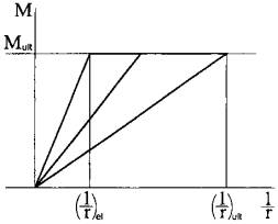 Граничное значение кривизны и жесткости для горизонтального участка диаграммы бетона получается при εb,pl = εb,el и εb,pl = εb,ult. Исходя из этого может быть представлена диаграмма «момент-кривизна», которая описывает деформированное состояние железобетонного элемента в целом. Упрощенно принимаем диаграмму «момент-кривизна» двухлинейной (рис. 8).
