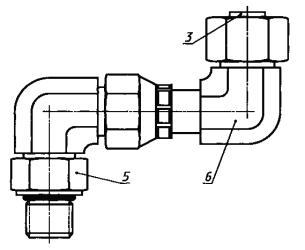 Испытуемый блок соединений трубопроводов с ввертным концом без трубы 1 - ввертное прямое соединение; 2 - угловое соединение; 3 - заглушка или пробка; 4 - труба; 5 - угловое соединение с ввертным концом, регулируемым по направлению