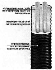 Трубопроводы из полиэтиленовых труб в теплоизоляции из пенополиуретана (ППУ). Изначально пенополиуретаном (ППУ) изолировались стальные трубопроводы для канальной и бесканальной прокладки наружных сетей теплоснабжения. Как и все стальные трубопроводы, они имели существенный недостаток - невысокая коррозионная стойкость. Для устранения этого недостатка вместо стальных труб стали применять трубы из полиэтилена. Так появились предварительно изолированные трубопроводы системы Изопекс, конструкция которых включает в себя несущую трубу из модифицированного полиэтилена, изолированную пенополиуретаном и наружной бесшовной гидрозащитной гофрированной полиэтиленовой оболочкой (рис.1).