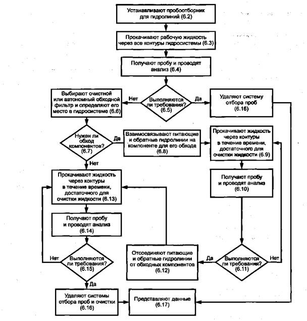 Дата введения - 2008-12-01 1 Область примененияНастоящий стандарт устанавливает методику определения и оценивания требуемого уровня чистоты собранных гидросистем после их изготовления. Примечание - Рекомендуется, чтобы компоненты и части, используемые в подобных гидросистемах, были чистыми перед сборкой. Руководство приведено в ИСО 18413. 2 Нормативные ссылкиВ настоящем стандарте использованы нормативные ссылки на следующие стандарты: ИСО 3722:1976 Гидроприводы объемные. Сосуды для проб жидкости. Оценка и контроль способов очистки ИСО 4021:1992 Гидроприводы объемные. Гранулометрический анализ. Взятие проб жидкости из линий работающих гидросистем ИСО 4407:2002 Гидроприводы объемные. Загрязненность жидкости. Определение уровня загрязненности твердыми частицами методом их подсчета с помощью оптического микроскопа ИСО 5598:1985 Гидроприводы объемные, пневмоприводы и их компоненты. Словарь ИСО 11500:1997 Гидроприводы объемные. Определение загрязненности твердыми частицами с помощью автоматического подсчета с использованием принципа поглощения света 3 Термины и определенияВ настоящем стандарте применены термины по ИСО 5598, а также следующие термины с соответствующими определениями: 3.1 очистной фильтр (clean-up filter): Высокоэффективный фильтр, способный обеспечивать требуемый уровень чистоты. 3.2 автономный обходной фильтр (off-line loop filter): Фильтр или другое фильтрующее устройство, установленное за пределами собранной гидроприводной системы и присоединенное к ней для обеспечения фильтрования жидкости, и удаляемое из системы после оценки ее чистоты. 3.3 анализ методом счета частиц (particle count analysis): Определение распределения частиц по размерам в установленном объеме пробы жидкости в установленное время с применением автоматических счетчиков частиц или других проверенных методов. 3.4 анализ в неавтономном режиме (on-line analysis): Анализ жидкости, поступающей из гидросистемы непосредственно в измерительный прибор. 3.5 анализ в автономном режиме (off-line analysis): Анализ пробы жидкости с помощью измерительного прибора, который не присоединен непосредственно к гидросистеме. 3.6 потребитель (purchaser): Сторона, предъявляющая требования к машине, оборудованию, системе или компоненту и оценивающая соответствие продукции этим требованиям. 3.7 поставщик (supplier): Сторона, которая принимает на себя обязательство предоставлять продукцию, удовлетворяющую требованиям потребителя. Примечание - Производитель и поставщик могут быть одним лицом или компанией. 4 Оборудование для испытаний4.1 Пробоотборник жидкости из гидролинии по ИСО 4021. Если подобные пробоотборники отсутствуют и проба берется из основного потока, то может быть использовано отверстие для измерения давления. 4.2 Сосуды для проб жидкости, калиброванные в соответствии с требованиями ИСО 3722. При проведении анализа в неавтономном режиме подобные сосуды для проб не требуются. 4.3 Автоматический счетчик частиц по ИС011500 или оптический микроскоп, или анализатор изображений по ИСО 4407. 4.4 Очистной фильтр или автономный обходной фильтр и средство обеспечения циркуляции рабочей жидкости через фильтр. 5 Отбор пробПРЕДУПРЕЖДЕНИЕ - Отбор проб из гидролиний высокого давления может быть опасным. Следует использовать средства сброса давления. Пробы не следует отбирать из гидробака гидросистемы, за исключением случаев отсутствия альт