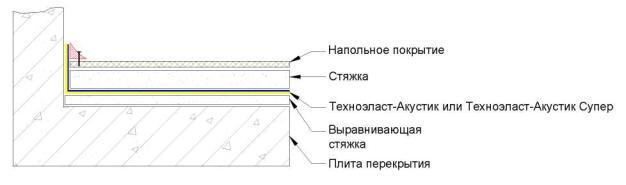 Москва 2007 г. Содержание1. Введение.Современный ритм жизни в мегаполисах несет в себе массу вредных воздействий, направленных на человека. Одним из наиболее вредных воздействий является разнообразный шум: работающая офисная техника, шум двигателя автомобиля, производственные шумы. Среда, в которой находится человек, ограниченная помещением, должна иметь такие характеристики, которые создавали бы комфортные условия для труда или отдыха человека. В последние годы проблемам звукоизоляции уделяется все больше внимания: человек хочет чувствовать себя более защищенным от внешней среды, посторонних звуков и шума. Наука не стоит на месте, и развивается в соответствии с этими возросшими требованиями, предлагая новые строительные материалы для решения этих проблем. Наряду с воздушным шумом, в ограждающих конструкциях возникает и структурный шум - звук, распространяющийся в твердом теле, одной из форм которого является ударный шум под плитой перекрытия. Любое динамическое воздействие на несущую конструкцию передает по ней звуковые колебания, которые, в конечном итоге создают звуковое давление на человека. Компания ТехноНИКОЛЬ, являясь лидером на российском рынке гидроизоляционных мембран, не осталась в стороне от проблемы звукоизоляции. В результате плодотворной работы специалистов научного центра компании совместно с НИИСФ РААСН были созданы материалы Техноэласт-Акустик и Техноэласт-Акустик Супер, применение которых в строительстве направлено на изоляцию ударных шумов, передающихся по несущей конструкции здания. Настоящая инструкция распространяется на устройство изоляции от ударных шумов в конструкции плавающих полов, применяемых в производственных, жилых, общественных, административных и бытовых зданиях. В инструкции изложены характеристики звукоизоляционных материалов Техноэласт-Акустик и Техноэласт-Акустик Супер, процедура укладки материалов, приведены конструкции плавающих полов. При проектировании и устройстве полов, кроме указаний по укладке звуко- и гидроизоляционных материалов, должны выполняться требования действующих норм проектирования, правил техники безопасности по охране труда и противопожарной безопасности. 2. Описание материалов для звукоизоляции.Техноэласт-Акустик (ТУ 5763-005-72746455-2007) - материал рулонный звукоизоляционный прокладочный. Материал производится на основе звукоизоляционного стеклохолста, на одну сторону которого нанесен слой битумно-полимерного вяжущего, защищенного полимерной пленкой; применяется для устройства звукоизолирующих прокладок в конструкциях "плавающих полов" или других конструкциях, где требуется изоляция от ударных шумов. Внешний вид материала приведен на фото.