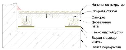 Звукоизоляционный материал укладывается непосредственно на выравнивающую стяжку под деревянные лаги звукоизолирующей основой вниз таким образом, чтобы он выходил из-под лаги на величину не менее 20 мм. В случае, если необходимо выполнить еще и гидроизоляцию пола, используют только материал Техноэласт-Акустик Супер, укладывая его по всей поверхности пола. Для лаг используют нестроганые доски (ГОСТ 2695-83*, ГОСТ 8486-86*Е) 2-го и 3-го сортов из здоровой антисептированной древесины хвойных и мягких лиственных пород, за исключением липы и тополя. Толщину лаг, опирающихся непосредственно на звукоизоляционный материал следует принимать равной 40 мм и шириной 80 - 100 мм. Пролет лаг следует принимать не более 0,9 м. В покрытиях из паркетных досок толщиной 25 мм, пролет лаг принимают 400 - 500 мм, в покрытиях их паркетных щитов - 300 - 400 мм. При больших эксплуатационных нагрузках на пол, шаг лаг и их толщину следует устанавливать по расчету. Между лагами и стенами оставляют зазор 20 - 30 мм. Длина стыкуемых лаг должна быть не менее 2 м. Для изоляции от воздушного шума пролет между лагами может быть заполнен минераловатным утеплителем, обернутым в полиэтиленовую пленку. 3.3. Конструкция пола с укладкой звукоизоляционного материала под финишное покрытие.